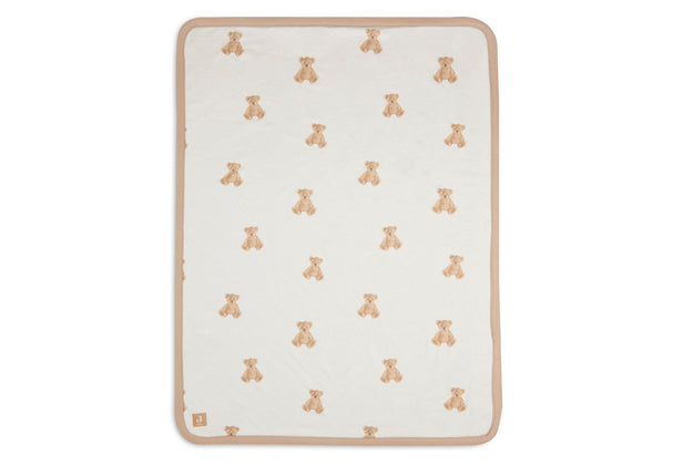 Diese Decke hat einen Hintergrund in der Farbe Ivory und die Bären auf dem Print haben die Farben Biscuit und Chestnut. Die Rückseite der Decke ist aus Fleece in der Farbe Biscuit.