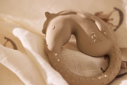 Entdecke das tolle Naturkautschuk-Spielzeug für Babys: robust, weich und sicher. Darauf kann dein Kind prima kauen und es ist leicht sauber zu halten. Entscheide dich für Kautschuk und lasse dein Baby sicher auf Erkundungstour gehen! Dieser Biscuit-farbene Beißring in Form eines Pferds unterstützt die Entwicklung des Kiefers und kann Schmerzen beim Zahnen lindern und bietet gleichzeitig Ablenkung.