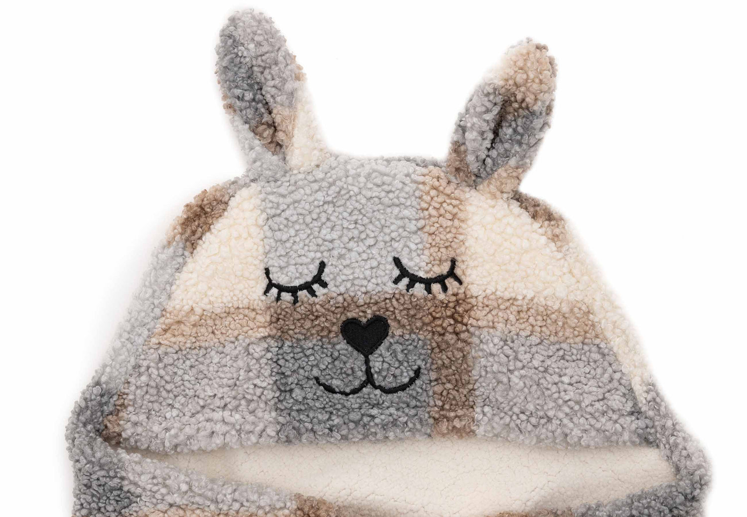 Einschlagdecke mit megahohem Niedlichkeitsfaktor. Der grobe Bouclé-Stoff an der Außenseite passt perfekt zur Check Bouclé Krabbeldecke. Die Innenseite ist aus einem hübschen Coral-Fleece-Stoff. Wickle dein Baby in diese Einschlagdecke und schließe die Decke mit den praktischen Klettbändern. Setze deinem Baby das Mützchen auf und schon siehst du die süßen Ohren und das Häschengesicht auf der Mütze. Total süß! Diese Einschlagdecke kann direkt nach der Geburt verwendet werden. Und sie ist auch sehr praktisch im Kindersitz. Die schönen kühlen Farben und der lustige Karoprint sorgen für skandinavisches Ambiente!