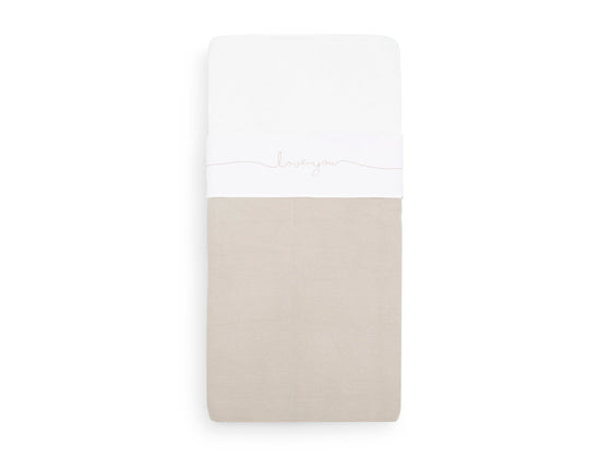 Nice white sheet with text from Jollein. The sheet is made from cotton and its size is 75x100 cm. The sheet is white and the text ‘Love you’ is in nougat colour.