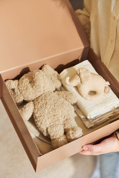 This cute rattle with a ring makes a cheerful sound and is easy for little hands to hold. The embroidered spots, gingham ears, and stitched eyes make the design extra sweet. The knotted tail and Jollein label make the rattle even more interesting for your mini. Perfect for developing your baby’s senses!