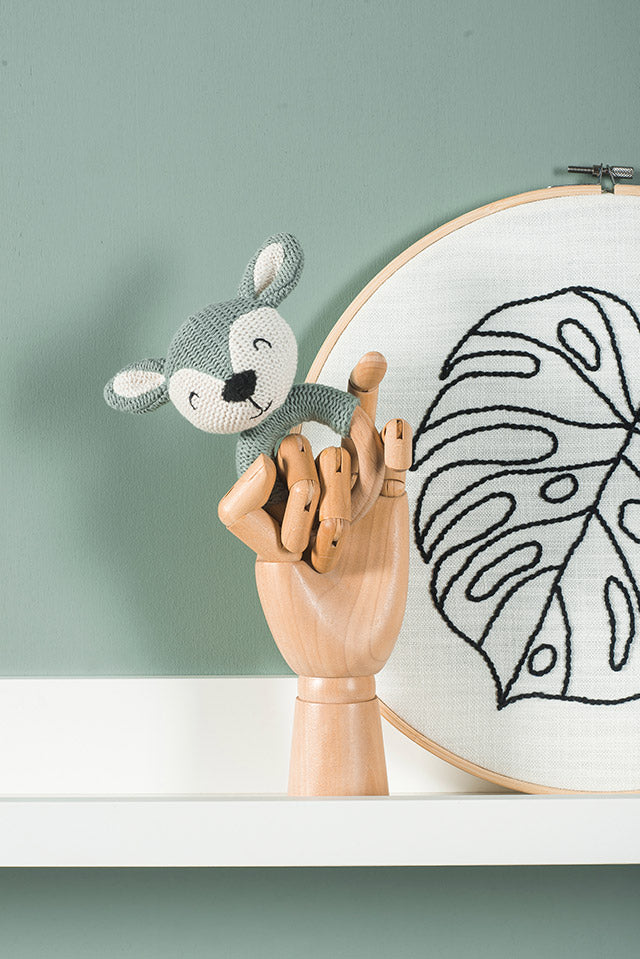 Beautiful teether by Jollein with knitted deer. The teether is available in the colours green and pink and has a diameter of 7 cm. The animal on the teether is made of knitted cotton, filled with polyester and the ring itself is made of wood. There is a bell in the animal's head.