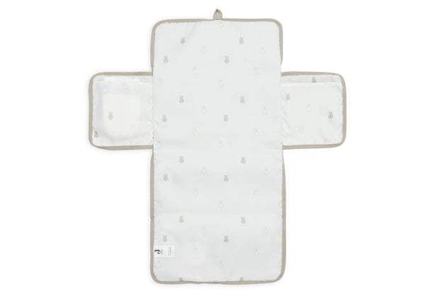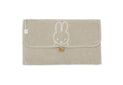 Our soft changing mat for babies is a must-have for on the road! This mat, made of cuddly terry cloth, has an adorable little Miffy on the front and a cute all-over Miffy print on the inside. The practical thing about this changing mat is that the inside can be wiped down with a cloth, making it very easy to clean. After use, you can easily close the mat with a loop and a wooden button. This makes the changing mat not only practical, but super adorable as well! Keep your child comfortable and change them in style, wherever you are, with our Miffy changing mat. Shop it in olive green or nougat.