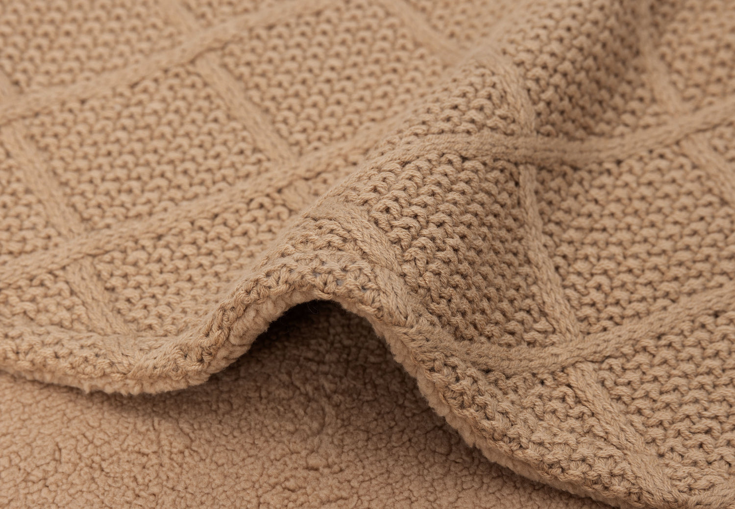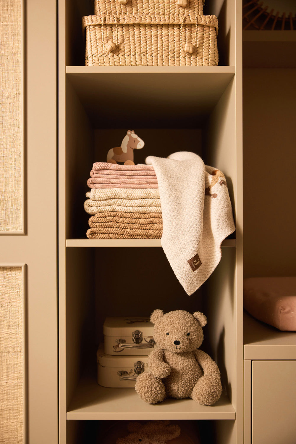 This lovely Check Knit knitted blanket made of cotton will certainly keep your little one warm! Ideal for use in a cot. The blanket can be combined well with one of our sheets. This not only looks great, it also means that you don't have to change the blanket every time. This nice knitted blanket with the checked Check Knit pattern keeps your little one nice and warm in combination with the soft teddy fleece inside. Will you pick the colour Oatmeal or Biscuit?