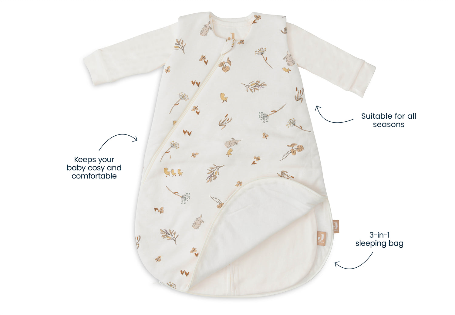 This 4-season sleeping bag comes with 3 TOG ratings depending on the combination. The inner bag has a TOG of 1.0, the outer bag 2.5, and together they provide a TOG of 3.5. That means your little one will sleep comfortably all year round. This sleeping bag is perfect for your newborn and of course this cute Riverside print looks lovely on your mini. The print is an all-over print with ducks, bunnies and riverside plants on an Ivory-coloured background.