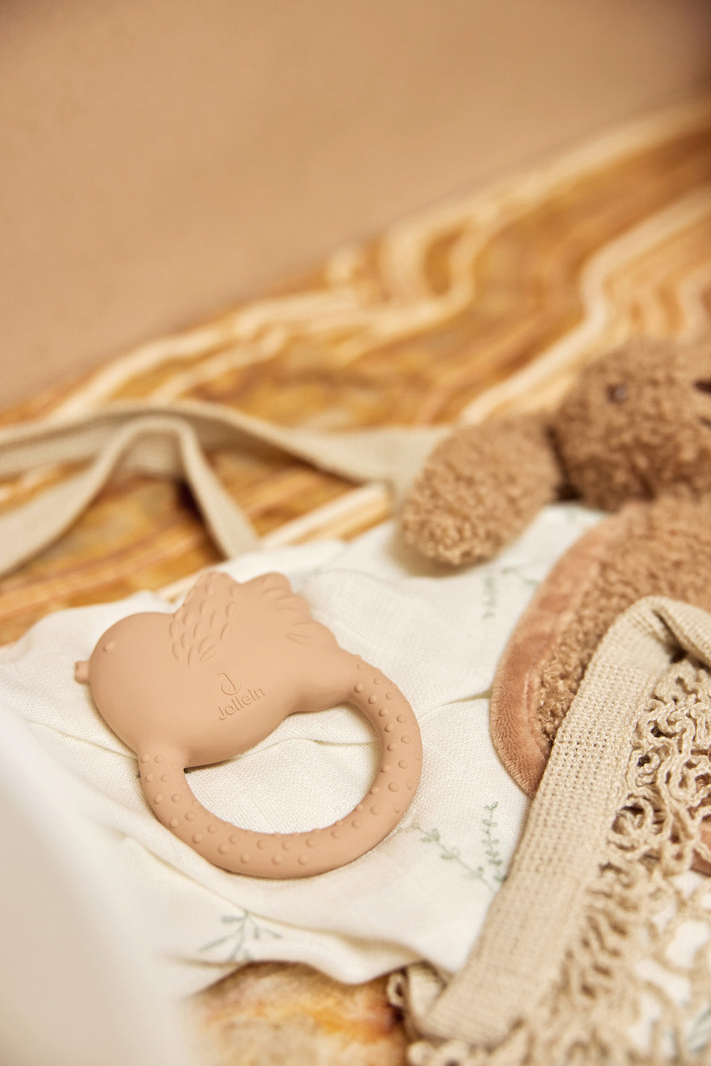 Never lose the pacifier again and enjoy this incredibly cute bunny toy at the same time? Yes please! This adorable pacifier cloth in the colour Biscuit has an embroidered heart as a nose and two drawstrings for play. The fabric on the back is soft velvet and on the front is beautiful bouclé. The piping is also velvet fabric and we are sure your little one will be a fan of this bunny.