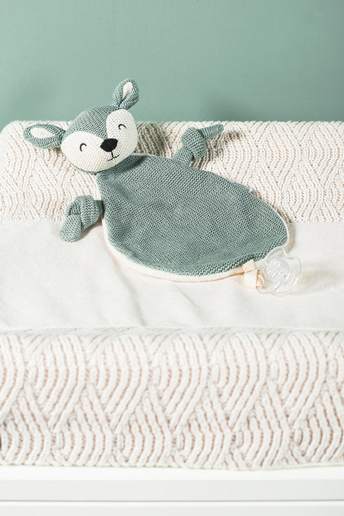 Your baby can cuddle with this cuddle cloth all day long. The knitted cloth has a soft back and a loop with which you can also attach it to the pacifier. This way you won't lose the pacifier as quickly.