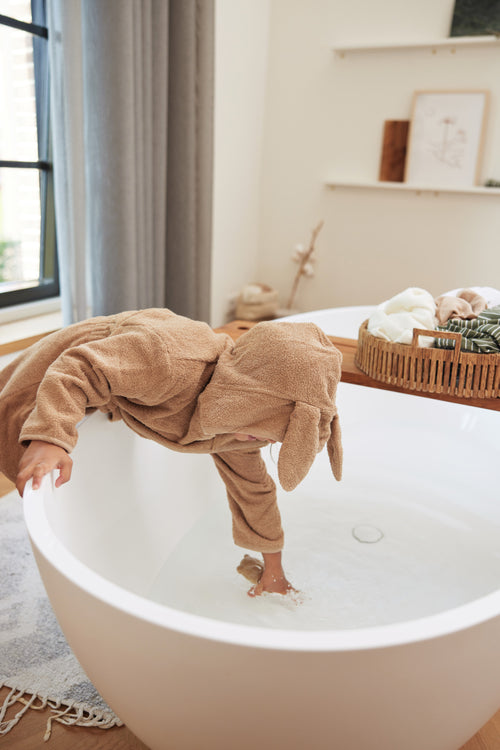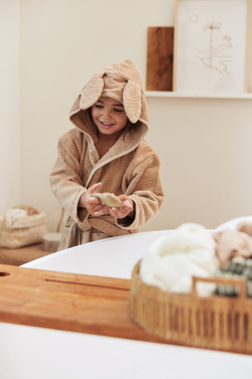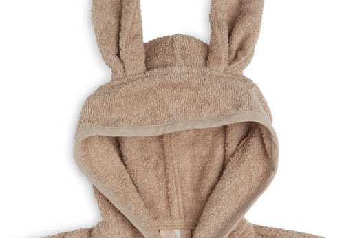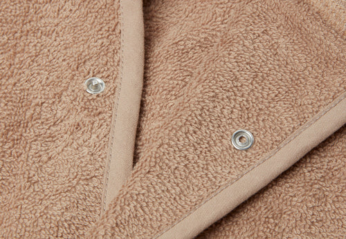 A terry bathrobe is always a practical item to have for your toddler. The bathrobe is perfect for after a bath, a shower or swimming. The soft terry cloth easily absorbs moisture and keeps your little one warm. The cheerful hood with ears will dry the hair. The bathrobe is also practical to take with you on holiday or to a sleepover. The bathrobe can be closed with a press stud, elastic in the back part ensures a perfect fit and the cord is attached to the bathrobe, so that you'll never lose it. The bathrobe is available in the colours: Sea Green, Ash Green, Biscuit, Caramel, Ivory, Jeans Blue, Nougat, Wild Rose, Pale Pink and Biscuit. Make sure to check out our striped bathrobes as well!