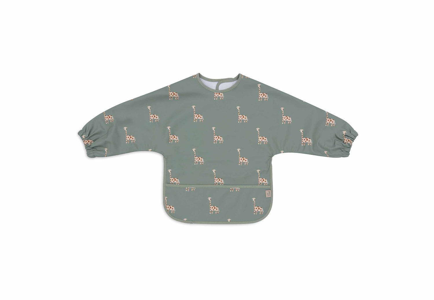 This bib with sleeves is great! This cute little apron protects your baby or toddler's clothes very well, thanks to the practical sleeves. Ever wondered why there is a double layer of fabric at the bottom? This was intentional! During independent eating, food regularly drips down the chin over the bib, but the bottom edge of the bib catches this as a practical collection tray. You’ll definitely appreciate it! Not only practical during meals, but also for crafts and finger painting. In our cute Jungle Jambo theme, this bib is even more fun, decorated with giraffes on an Ash Green coloured background!