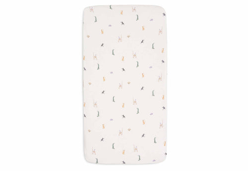 Keep your little one's mattress safe and comfortable with this cute fitted sheet. The cheerful Jungle Jambo print puts a smile on your little one's face and brings the jungle fantasy to life. The fitted sheet fits effortlessly around the mattress thanks to the elastic bands in each corner. Mix and match this fitted sheet perfectly with the blankets from the Grain Knit theme. Available in different sizes for cribs, cots and toddler beds.