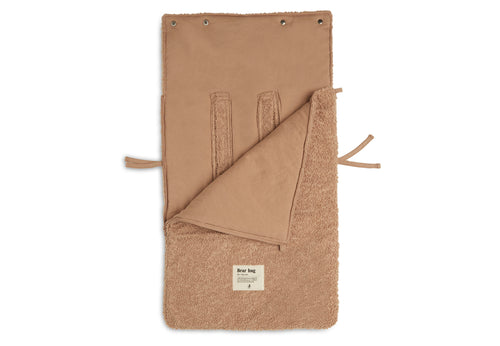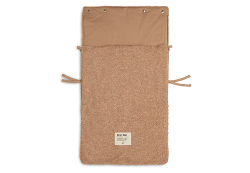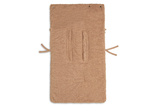 A foot muff is a really practical item. And how cute is this foot muff made of super cuddly Boucle! You can put your baby in the foot muff by zipping open the bag all the way. And if you want to take your baby out of the car seat, you can also zip open the foot muff completely. The topside of the foot muff can be changed in a cap with press-stud super quickly. This way, your baby's head will stay warm when you carry the car seat out of the car or when taking a walk. To make sure your baby won't get too warm when in the car, you can open the zipper as far as necessary. In short: a super handy comfort bag for your baby. The foot muff has openings at the back through which you can easily attach the belts. This is a universal foot muff for the Maxi Cosi and any other brand category 0 car seat with three-point or five-point belt. You can also use this comfort bag in the pram. This way, your baby will be wrapped up warm and comfy for your walk. You can also attach the foot muff to the pram from the back so that it won't slide off. Fantastic! Available in the colours Biscuit and Storm Grey. The outside is made of 100% polyester. The inside is made of soft Jersey cotton. The padding is made of 100% polyester fibre fill. The comfort bag is 52x110 cm. You can wash the foot muff at maximum 30 degrees. Follow the instructions on the wash label. This footmuff does not have a TOG rating, as it is designed to keep your little one warm on the go and not to be used as a sleeping bag.