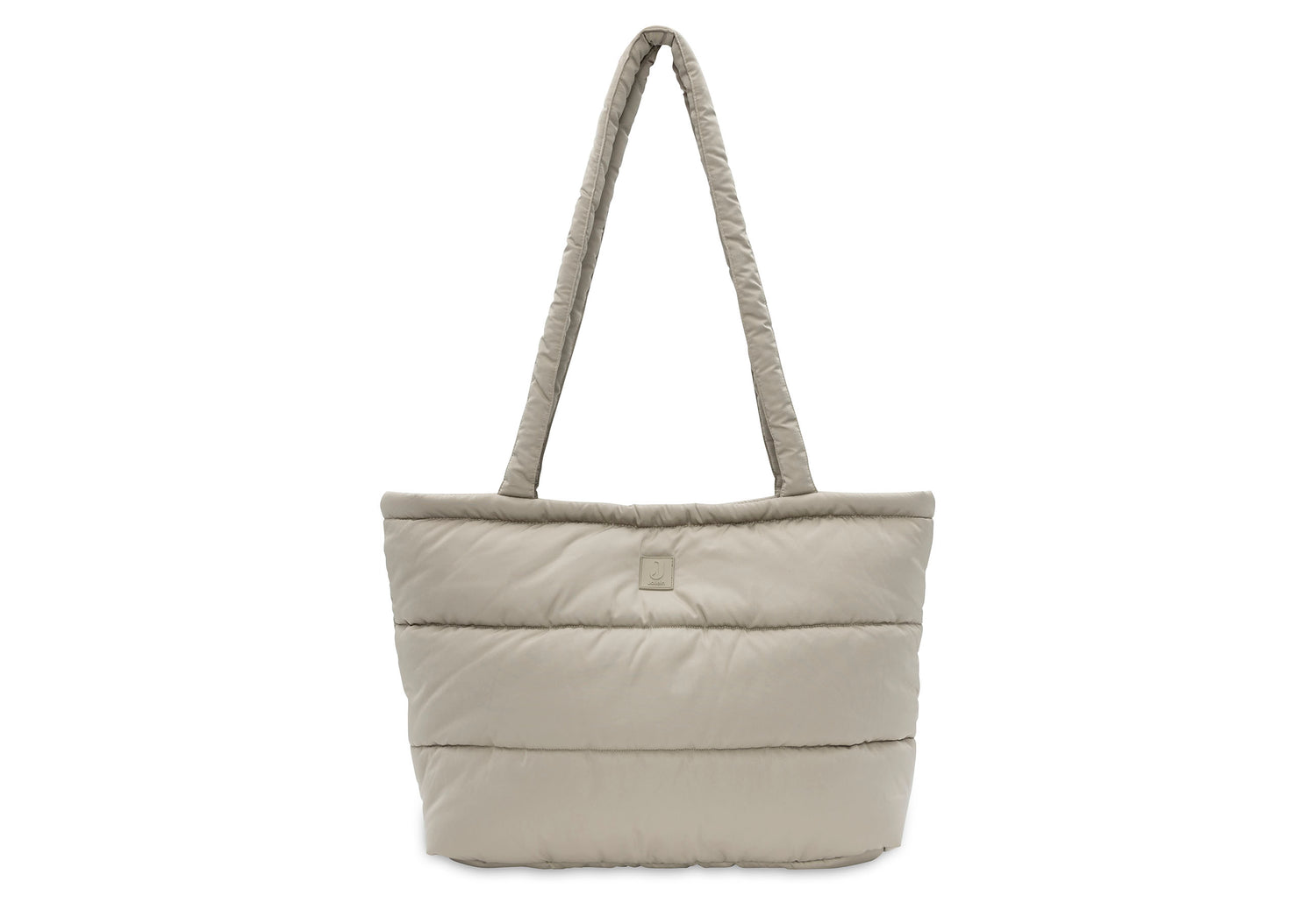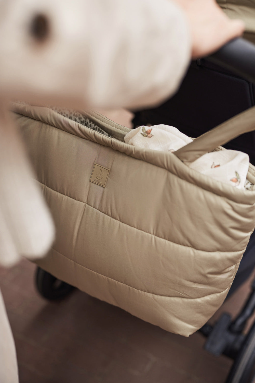 The perfect puffed mom bag! This bag is perfect when you're going on an outing with your little one. This bag is perfect for when you go on an outing with your little one. Of course, you can also use the bag for yourself, as a gym bag or a school bag. The bag is made of 100% recycled polyester, and it has a cute polka dot print on the inside. Furthermore, the inside offers 2 extra compartments and the bag comes with an included changing pad. The bag closes with a button and there is a zipper in the inner pocket. The bag has extra long handles, so that you can not just carry it on your shoulder, but also cross-body or on the stroller. Available in stylish, natural shades. Tip: Pair the diaper bag with our practical stroller hooks for even more convenience on the go!
