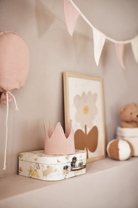 Turn every day into a party with this fun fabric flag garland! The flags have the beautiful natural colours Biscuit and Ivory. The flags can be reused and they're made of 100% muslin cotton. There are 6 flags on the garland in total: 3 wild rose coloured and 3 Ivory coloured, also available in the combination jeans blue/olive green. On both sides you will find a string of 20 cm to attach the flag garland. Very fun for parties or in the babyroom! Complete the party with the matching birthday crown and fabric balloon.