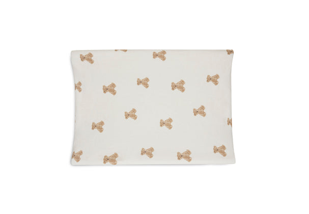 A cute jersey cover with a print of teddy bears that fits perfectly around your changing mat is the most practical basic in your layette. The fabric is soft and stretchy. Thanks to the elastic around the edge, the cover will stay properly in place around the cushion. And with this fun Teddy Bear print, it will also look cute and beautiful. Without a cover, the changing mat is pretty cold, and the plastic is not very comfortable. A loose towel will slip off, and it won't cover the edges. A standard hydrophilic cloth is too small and too thin to cover the changing mat properly. This changing mat cover will stay firmly in place, like a fitted sheet. You can easily wash it, and it will make your baby (and you) feel comfortable. Doesn't that sound great? We recommend buying multiple covers. There will always be at least one cover in the laundry. Changing mat covers have a lot to deal with. Like “Oops… the milk is running down my cheeks onto the cover” or “Ah.. I'll start peeing now that my diaper is off”. You can count on it… you will have to change the changing mat cover at least once a day, and sometimes even multiple times a day.