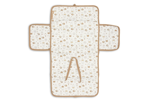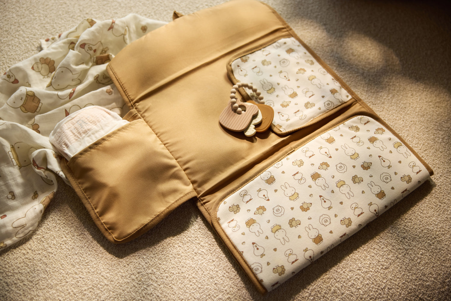 Our soft changing mat is a perfect must-have for on the go! The exterior features an all-over Miffy Family Farm print. The inside can be wiped clean easily, making it super convenient to use. Handy pockets store baby essentials, and a tie closure adds extra convenience. Practical and super cute for travel!