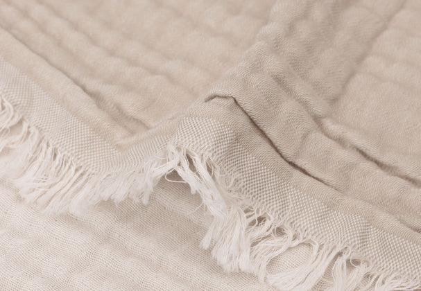 Our muslin blanket for babies with GOTS doesn't only offer softness and style, but versatility as well. Made of soft muslin material, this blanket has a fun fringe on the outside, for an extra charming touch. With a neutral ivory side and the choice between Moonstone or Olive Green on the other side, this blanket offers versatility and style. With a TOG-value of 1.0, this blanket is perfect for keeping your baby warm and comfortable, whether it's in the cradle or stroller or during cuddle time. You can also use this blanket as a big muslin cloth or towel. Create a calming and comfortable sleeping environment for your little one with our muslin blanket with fringe, a practical and versatile item for every parent. Available in 75x100 cm for the cradle and 120x120 cm for the cot.