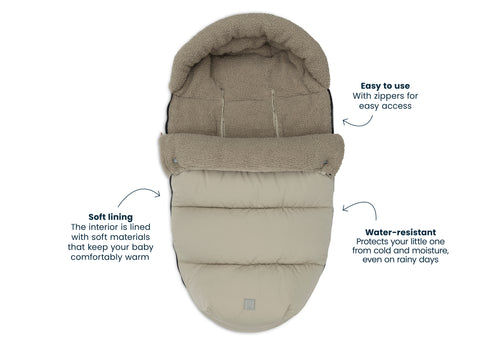 Keep your little one warm with Jollein's footmuff for the buggy/stroller. A real must-have for cold winter days. This footmuff has openings for a 3 and 5 point belt, perfect for the belts of the buggy or stroller. You can open the footmuff with the zipper, which moves both ways, so you can easily put your baby in and take them out again. The back of the footmuff has a practical hood, which you can fold around the head support of the buggy. This way, the footmuff will stay properly in place. The footmuff is waterproof, so your baby will be warm and dry! Which colour will you get? This footmuff does not have a TOG rating, as it is designed to keep your little one warm on the go and not to be used as a sleeping bag.
