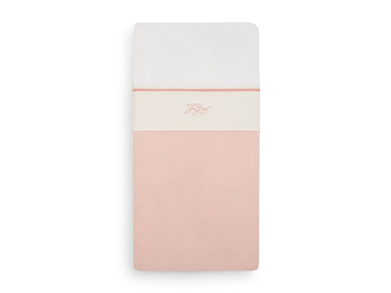 Soft white sheet that is suitable for the cot. The sheet has a nice print of a flower fitting with the Meadow theme. The print is chestnut (brown) or rosewood (pink) and the sheet itself is white. It is made of 100% cotton and measures 120x150 cm.