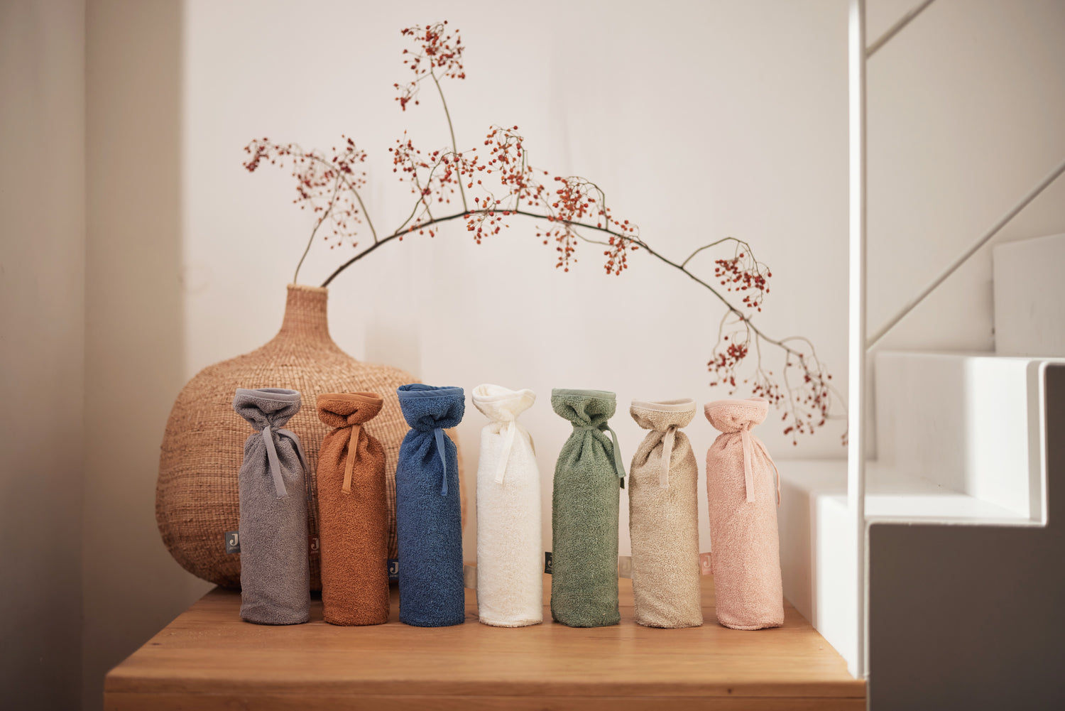 Beautiful terry hot water bottle bag from Jollein. The terry hot water bottle bag is made of 100% cotton and has a size of 35cm x Ø10 cm. The hot water bottle bag is available in white, pink, caramel, nougat, grey and green.