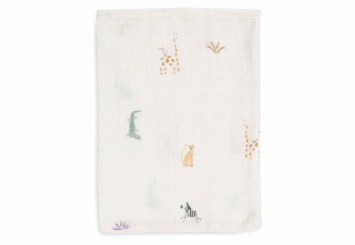 Muslin washcloths are useful when bathing your little baby. Also always useful for that quick morning wash on the changing mat. Your hand fits easily in the washcloth size and the muslin fabric is gentle on baby's delicate skin. The thin, smooth fabric makes it easy to reach the skin folds or under the chin without damaging the skin. Also useful on the go for cleaning dirty mouths and dirty hands. Just how cute is the Jungle Jambo print full of cheerful animals in beautiful colours? Perfect for little adventurers! These muslin mouth cloths come in a 3-pack, so you’ll always have plenty of them!