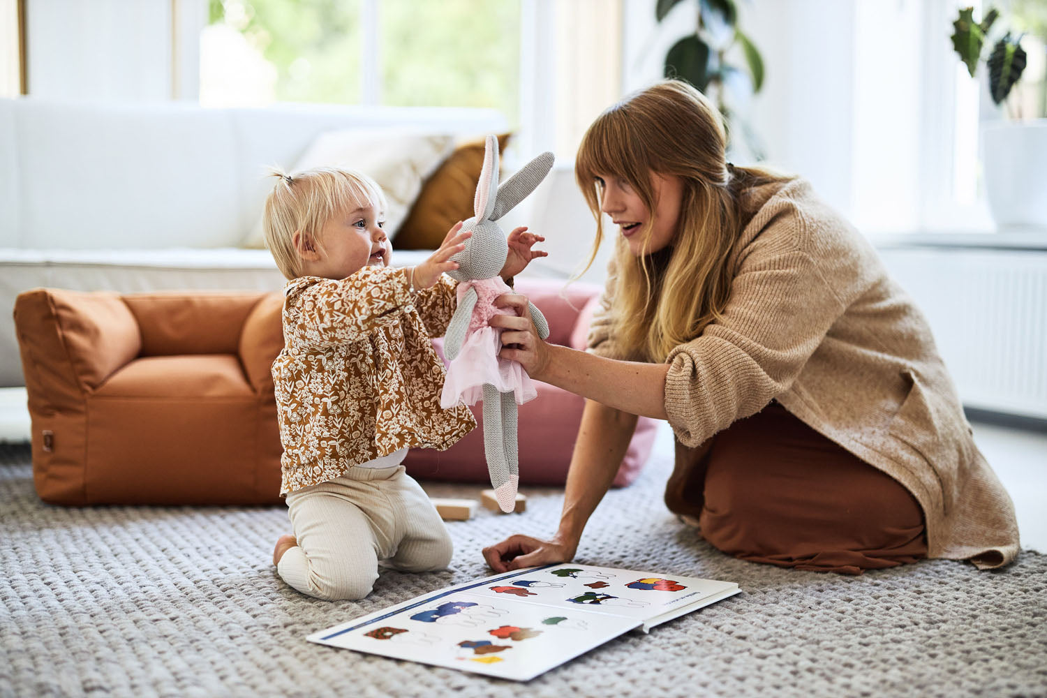 Les enfants aiment pouvoir s'y assoir. Ce pouf est pratique à placer au niveau de la table basse pour jouer à un jeu ensemble, pour se détendre et regarder la télévision. En outre il est également confortable dans le salon ou la chambre. Le sac peut être utilisé pendant longtemps par les enfants de 1 à 4 ans. La matière est facile à garder propre avec un chiffon humide.