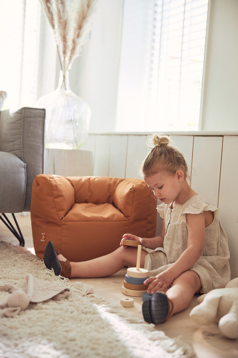 Beau pouf Jollein. Le pour est adapté aux enfants à partir de 1 an et peut être utilisé jusqu'à 4 ans inclus. Le pouf est disponible en gris, rouille et moutarde et est en PVC rempli d'haricots en EPS. Les dimensions du fauteuil sont 40x46x37 cm.