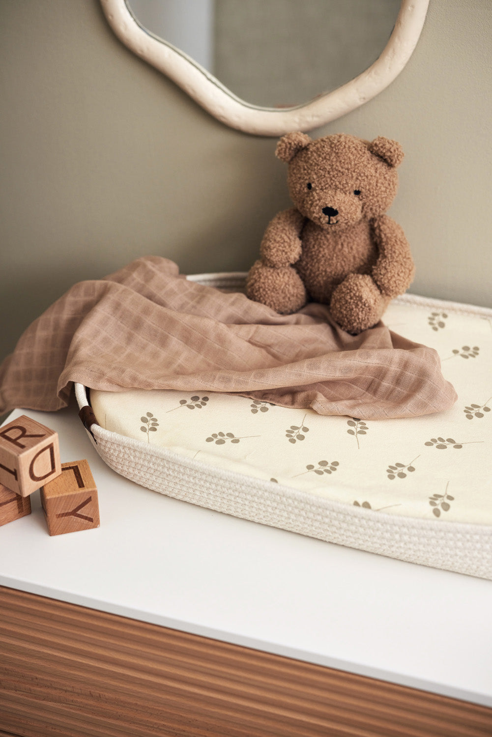Super ! Votre enfant a pris un bon bain ou vient de se réveiller, il est donc temps de le changer ou de l'habiller. Et rien n'est plus agréable que de s'allonger confortablement sur le matelas à langer avec ce beau basique. Cette housse de matelas à langer est ornée d'un joyeux imprimé intégral du thème Tiny Twig et est disponible en vert olive et rose sauvage.