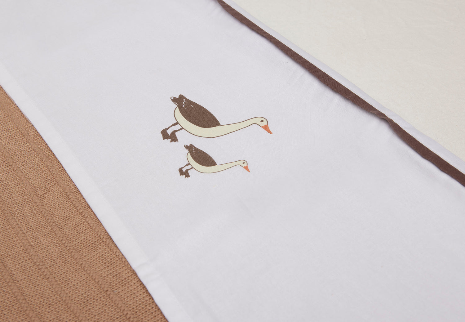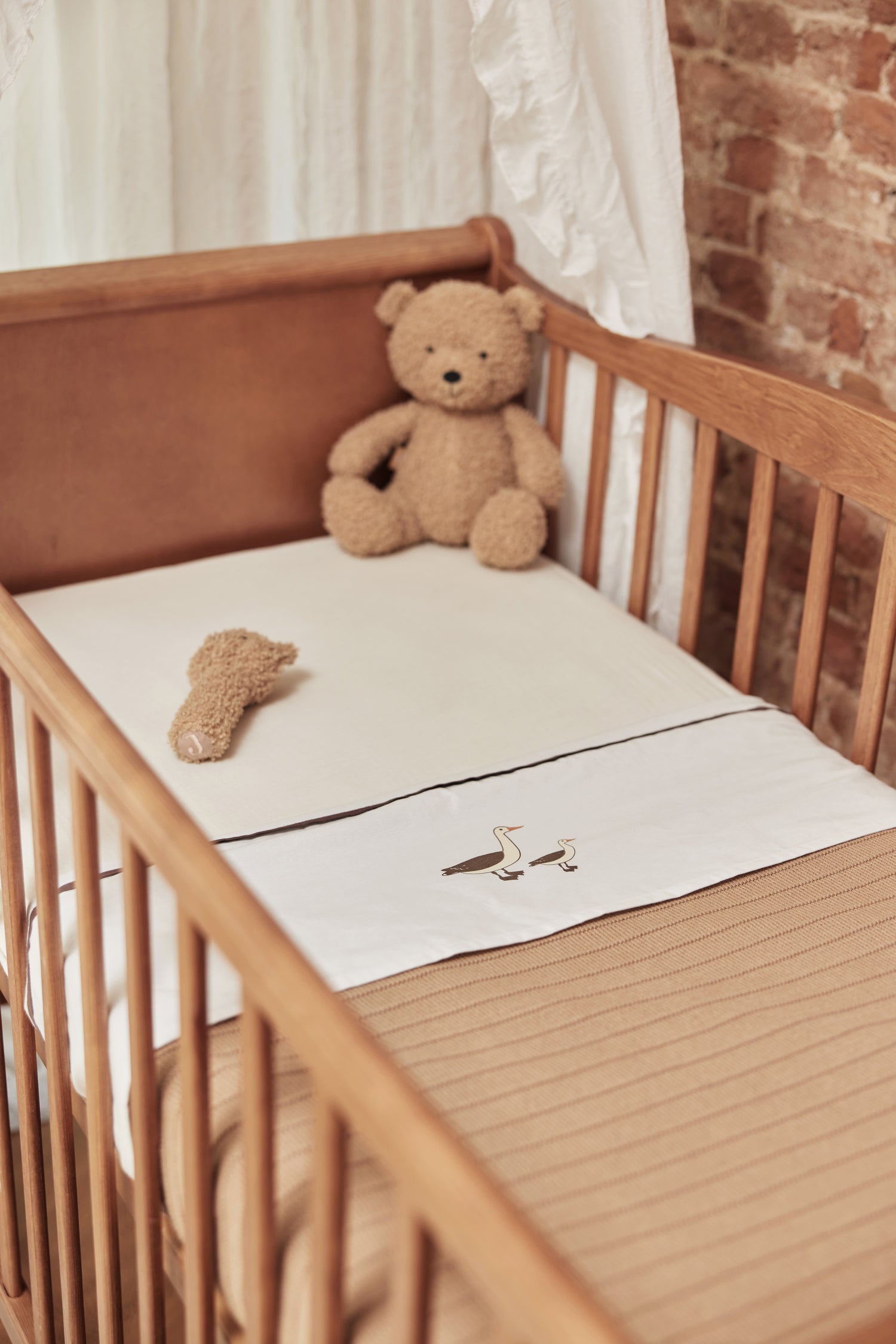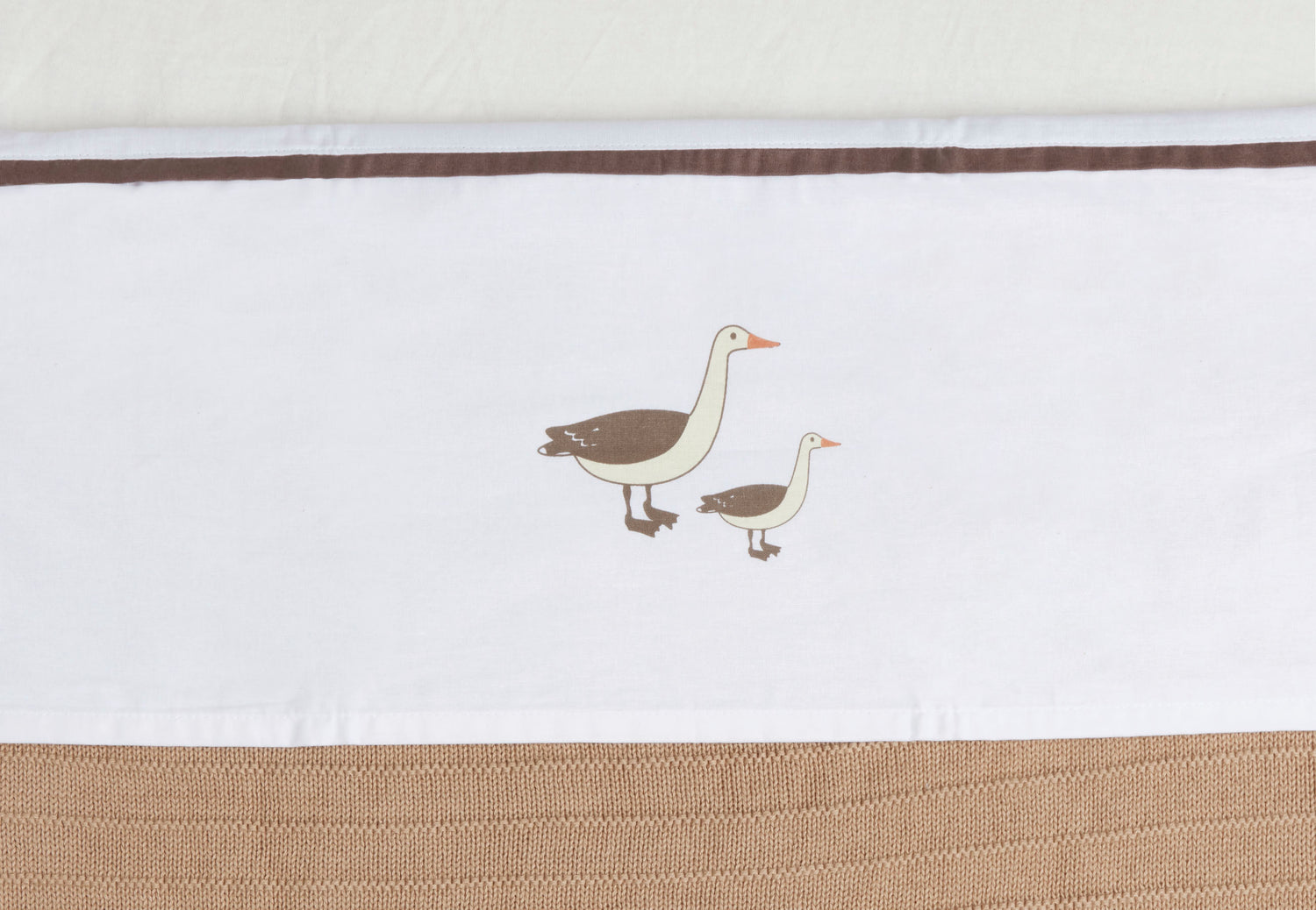 Drap de lit avec de mignonnes petites oies. Les côtés du drap peuvent être repliés sous le matelas pour un sentiment de sécurité supplémentaire. Tu peux assortir ce drap à la jolie petite gigoteuse avec des oisons. Agrémente la chambre d'un drap-housse de couleur biscuit et d'une moustiquaire de la même couleur.