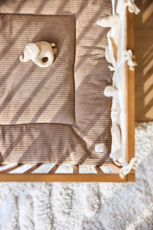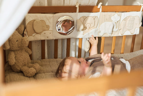 Ce jouet activité offre plein de possibilités de jeu : des petits miroirs pour éveiller la curiosité, des clochettes pour stimuler l’ouïe, du papier froissé pour explorer, et des tissus tout doux à câliner. Grâce aux cordons, il se fixe facilement au parc. C’est un cadeau de naissance idéal !