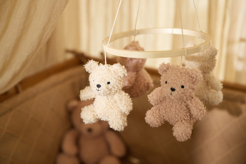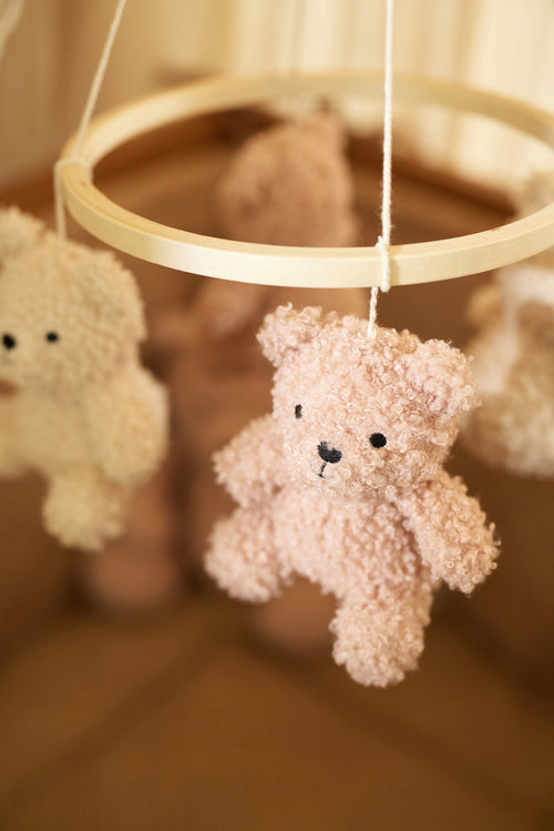 Ce mobile pour bébé avec des petits nounours est génial pour votre petit ! Fixez le mobile au bord du parc pour qu'il s'amuse ou bien au bord du lit pour qu'il s'endorme. Les nounours sont en Natural et Olive Green ou Natural et Wild Rose. Ce mobile fait un superbe cadeau (de naissance) ! Note : à l'exclusion du bras mobile en bois.
