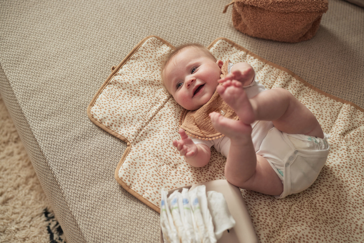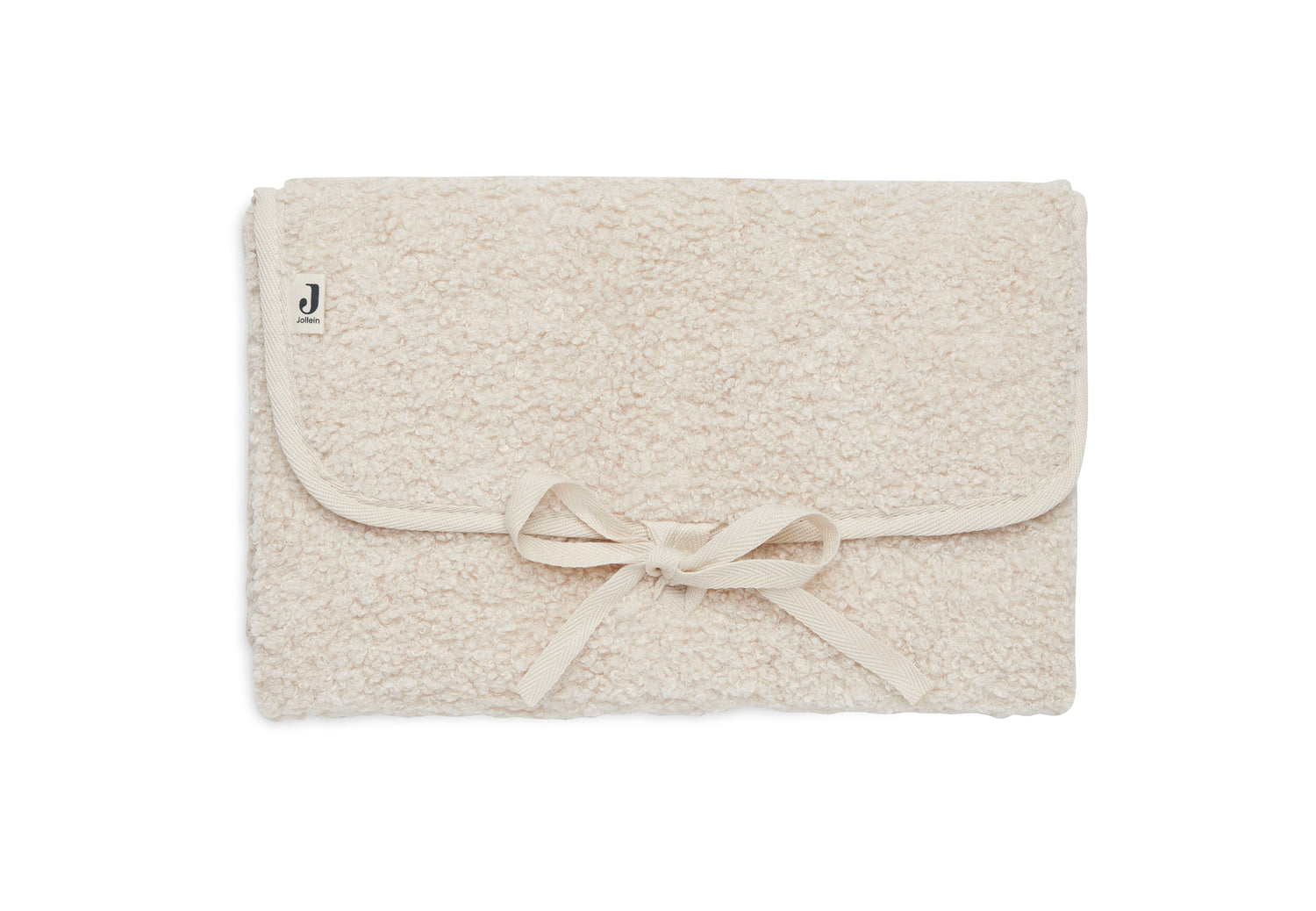 Le tapis à langer Boucle se marie bien avec les autres articles Boucle mais aussi parfaitement avec le sac Embroidery de Jollein.