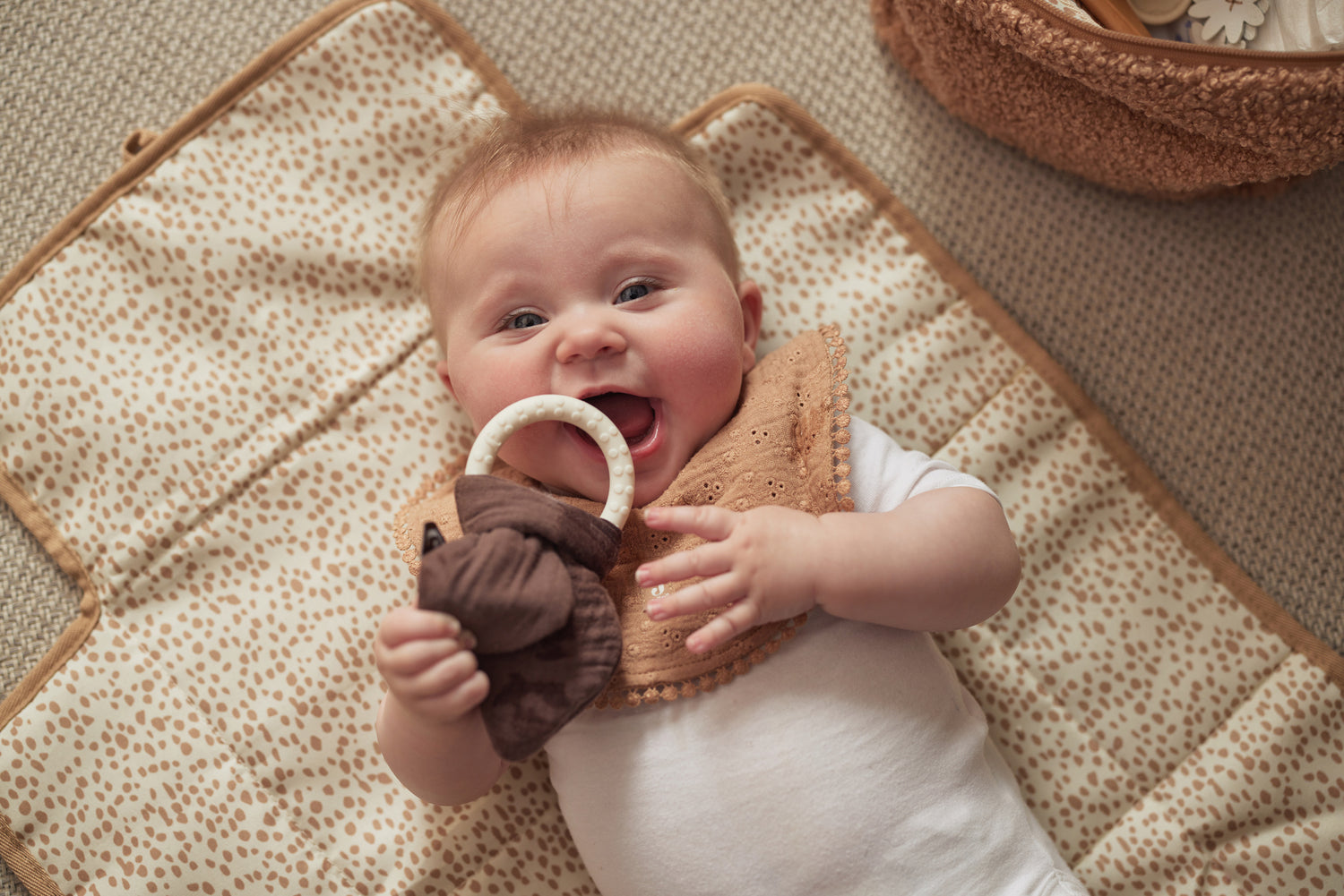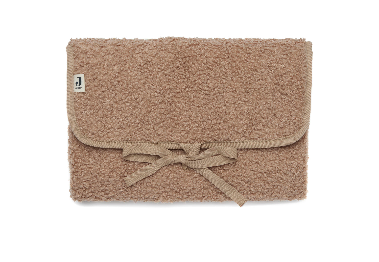 Le tapis à langer Boucle se marie bien avec les autres articles Boucle mais aussi parfaitement avec le sac Embroidery de Jollein.
