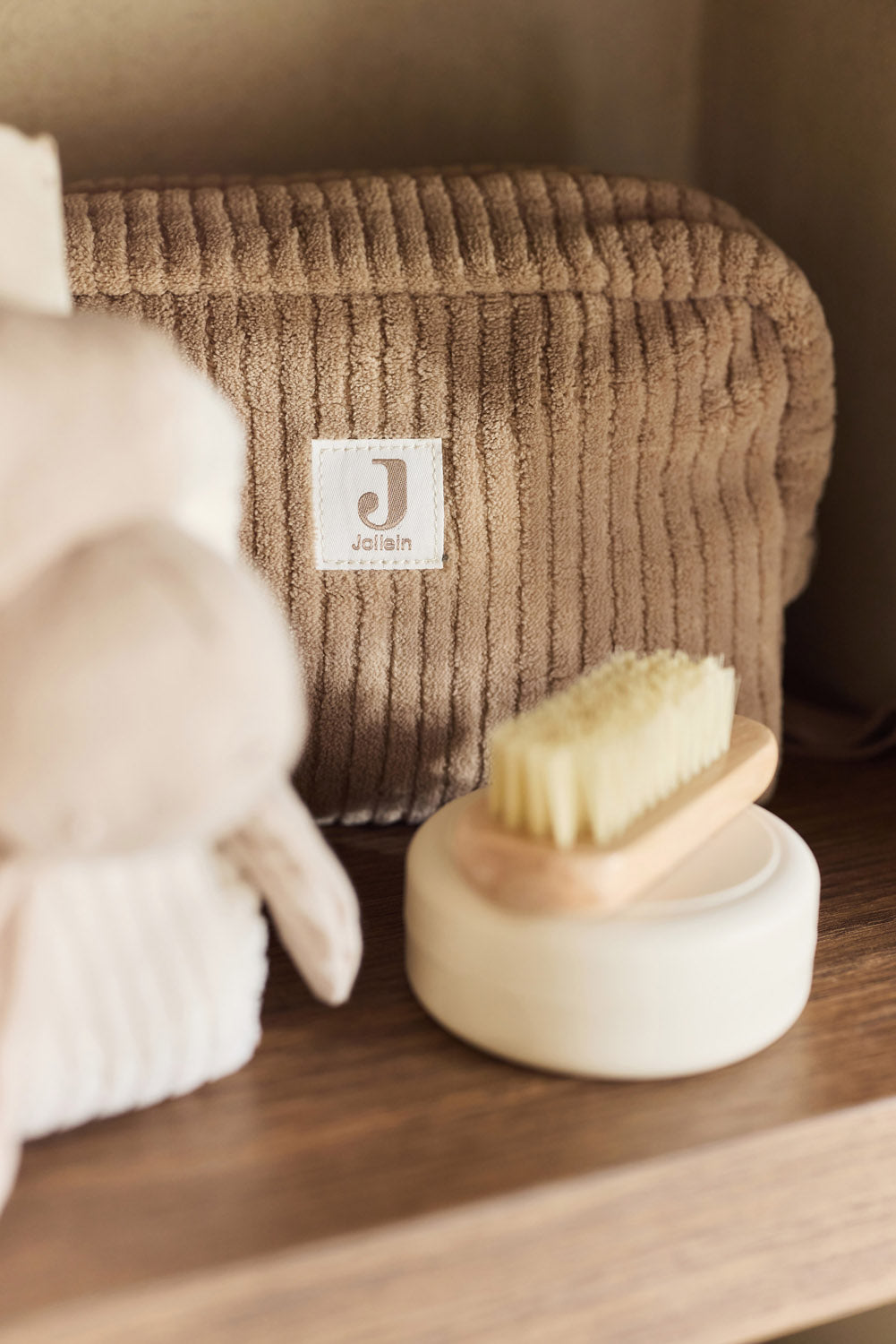 Cette trousse est faite d’un tissu côtelé doux avec un joli imprimé feuillage à l’intérieur. Idéale pour ranger les petits objets comme les produits de soin. Pratique, élégante, une belle addition à votre trousseau de naissance !