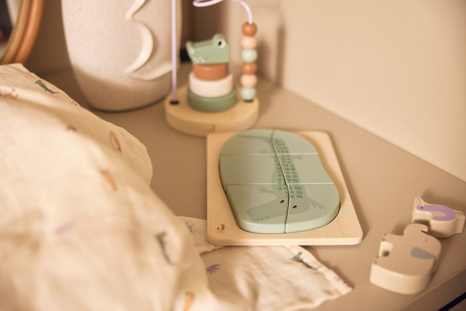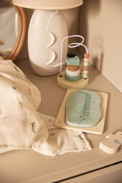 Découvrez notre étonnante tour à empiler, un must absolu pour les petits explorateurs ! Avec ces 4 cubes aux couleurs vives, le crocodile offre un plaisir d'empilage sans fin. Les 6 perles peuvent se déplacer le long de la spirale, ce qui offre non seulement des heures de divertissement, mais stimule également la motricité fine de votre enfant. Les couleurs tendance (lavande, caramel, Ivory et ash green non seulement rendent cette tour d'empilage méga mignonne, mais elles permettent aussi de faire un choix responsable en optant pour du bois 100 % certifié FSC. Bon amusement !
