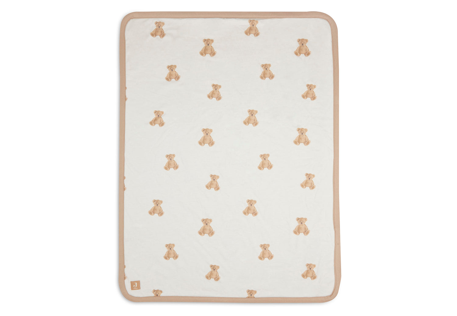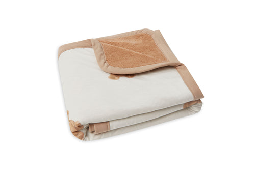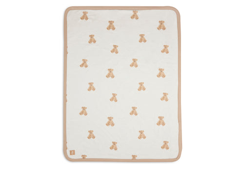 Deze deken heeft een Ivory ondergrond en de beertjes op de print hebben de kleuren Biscuit en Chestnut. De achterkant van het dekentje is gemaakt van fleece in de kleur Biscuit.